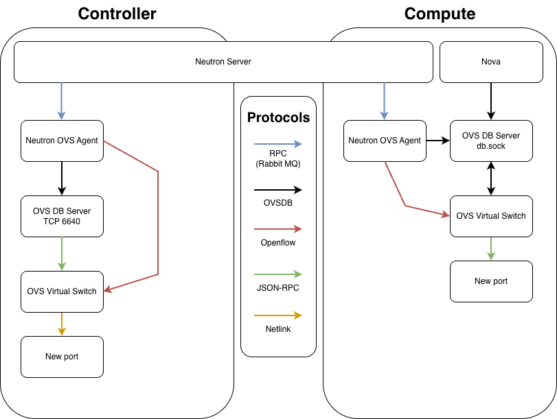 1. Messaging (RPC): The Neutron OVS Agent on the Compute node receives the RPC message from the Neutron Server (via RabbitMQ) containing the networking policy for a VM.